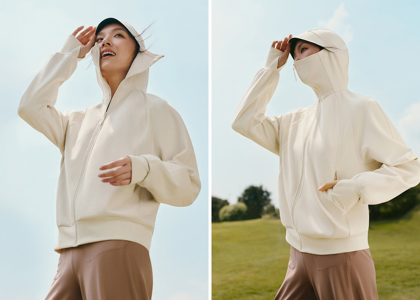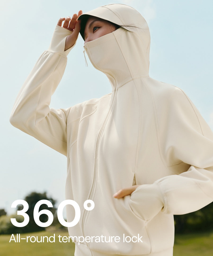 - 360° wind-shielding structure with hood, high collar, and thumbhole cuffs