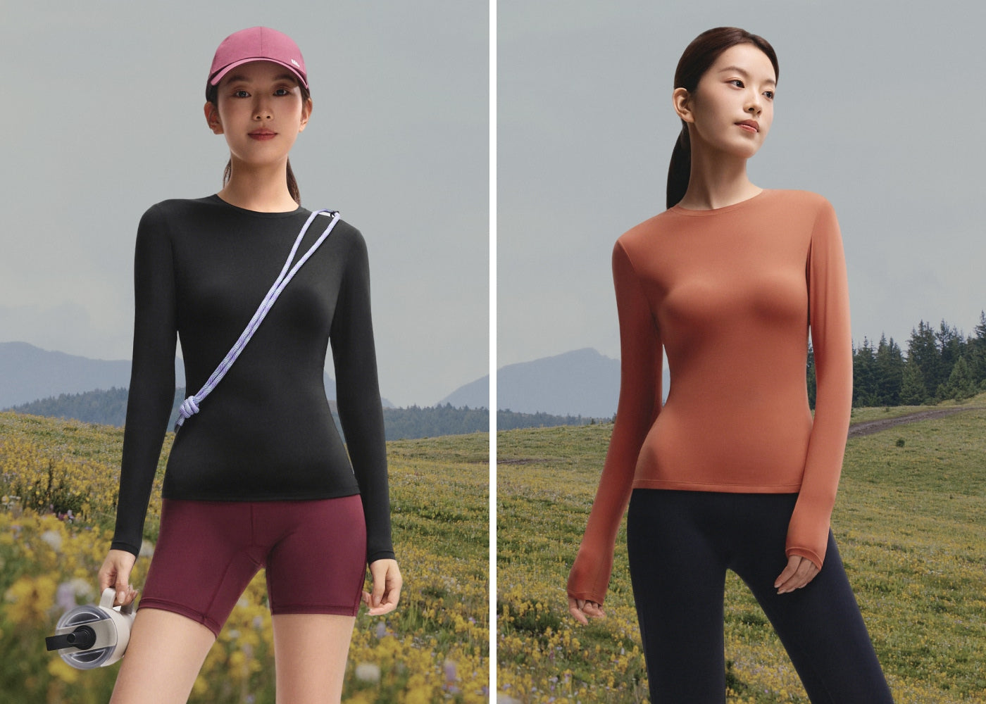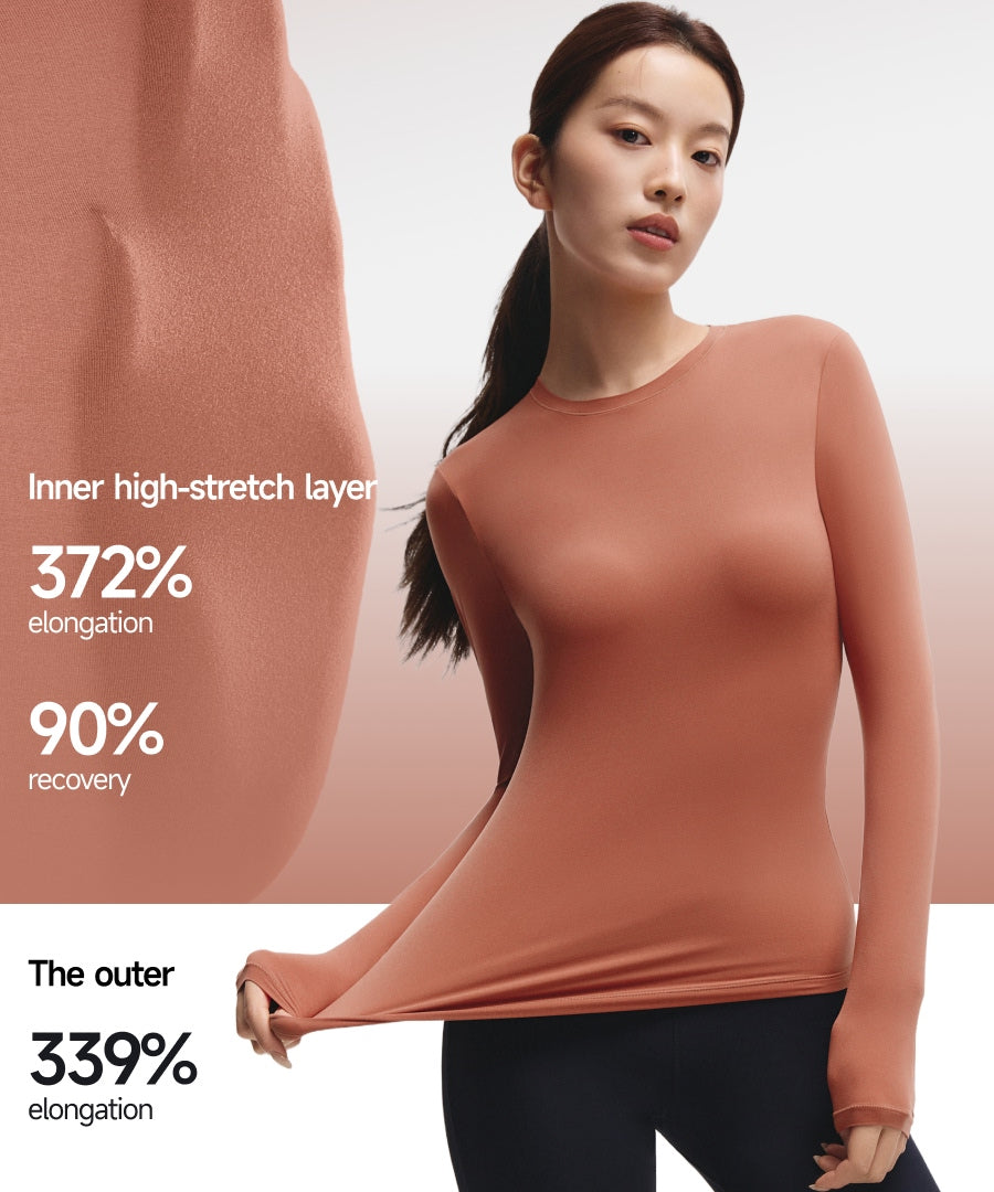 Inner high-stretch layer (372% elongation, 90% recovery) wraps firmly for support, while the outer (339% elongation) applies gentle counter pressure for a sleek, natural contour.