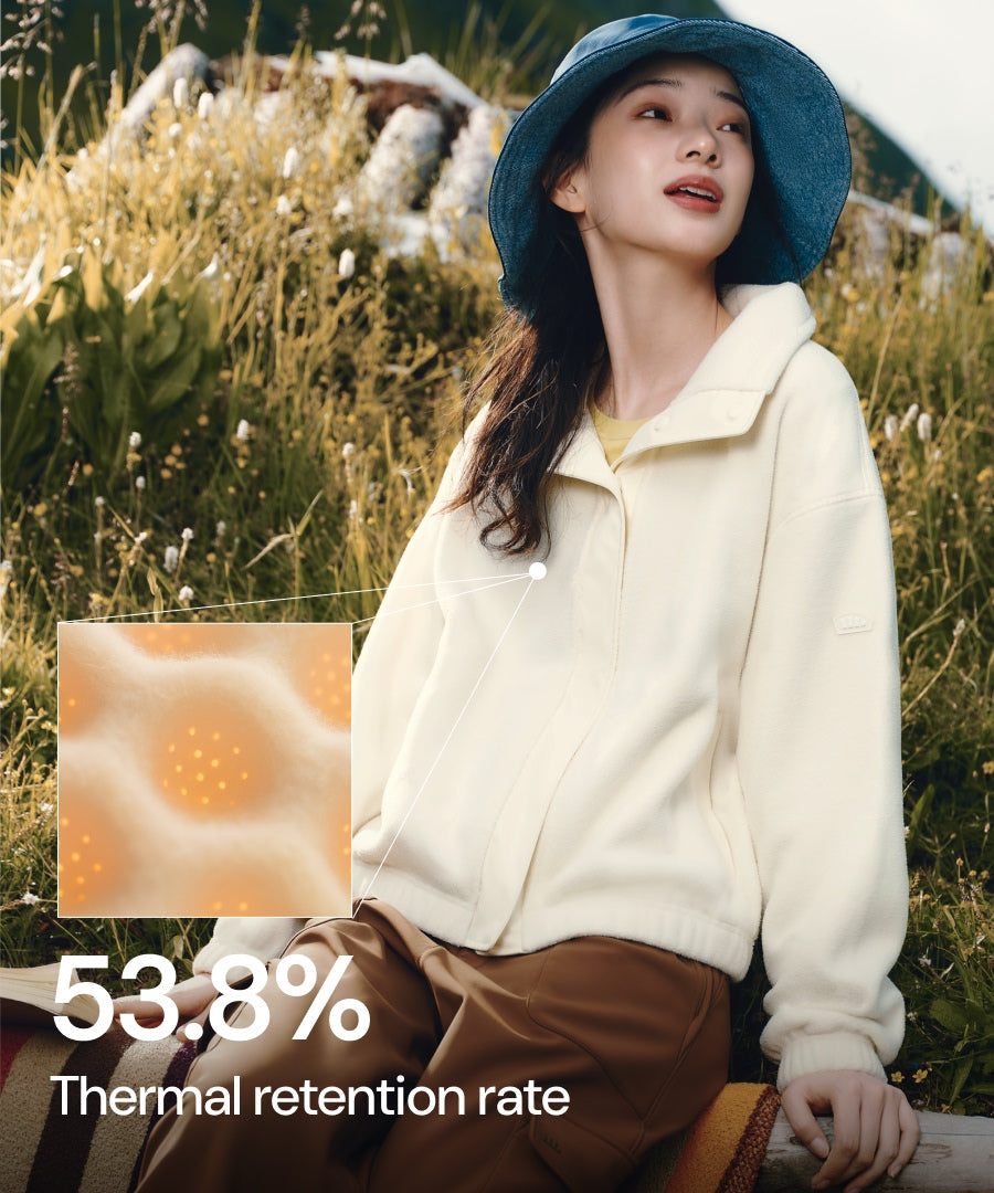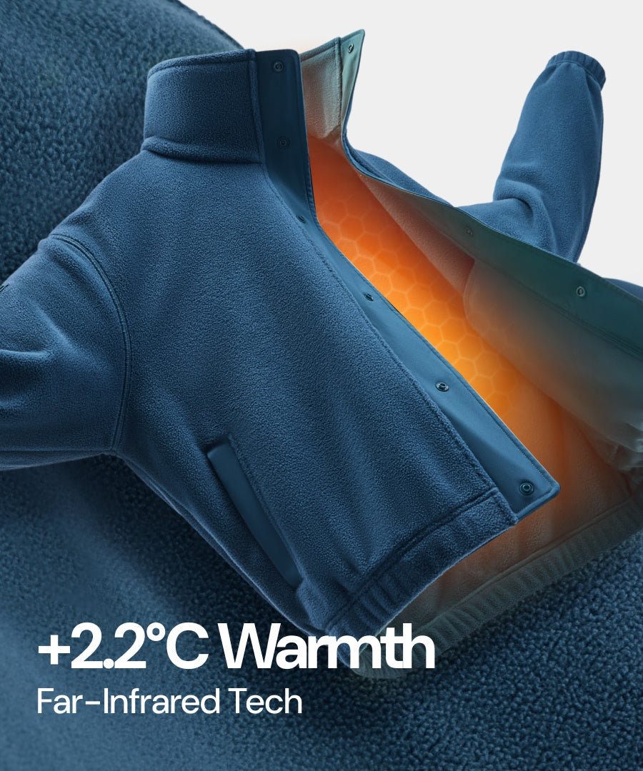 Built-in far-infrared technology gently raises body temperature by ~2.2°C. The expanded heat-storage capacity of the honeycomb fleece keeps warmth locked in, ensuring comfort even in cold outdoor conditions.