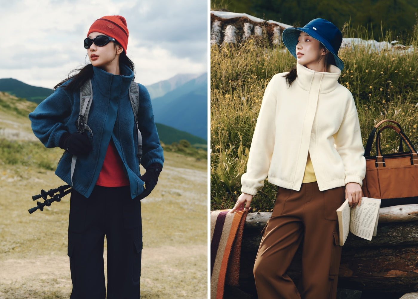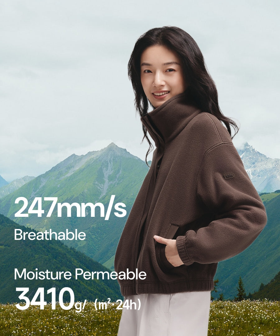 Featuring Flow-Free ventilation channels, the fleece achieves a breathability rate of 247mm/s and moisture permeability of 3410g/(㎡·24h). It efficiently disperses sweat and heat, keeping the body dry and fresh during active use
