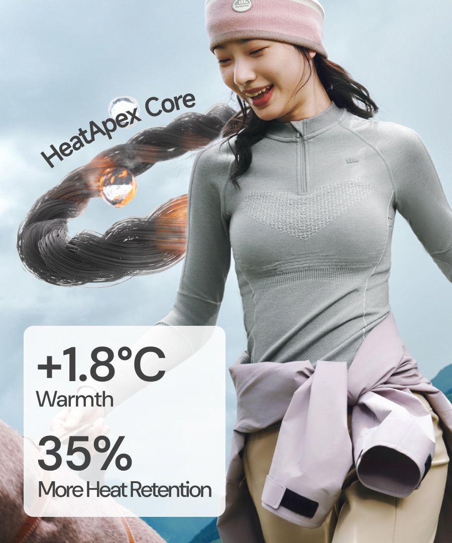 The HeatApex Core combines far-infrared heat storage with hollow-core fibers, boosting heat retention by 35% and providing up to +1.8°C warmth.