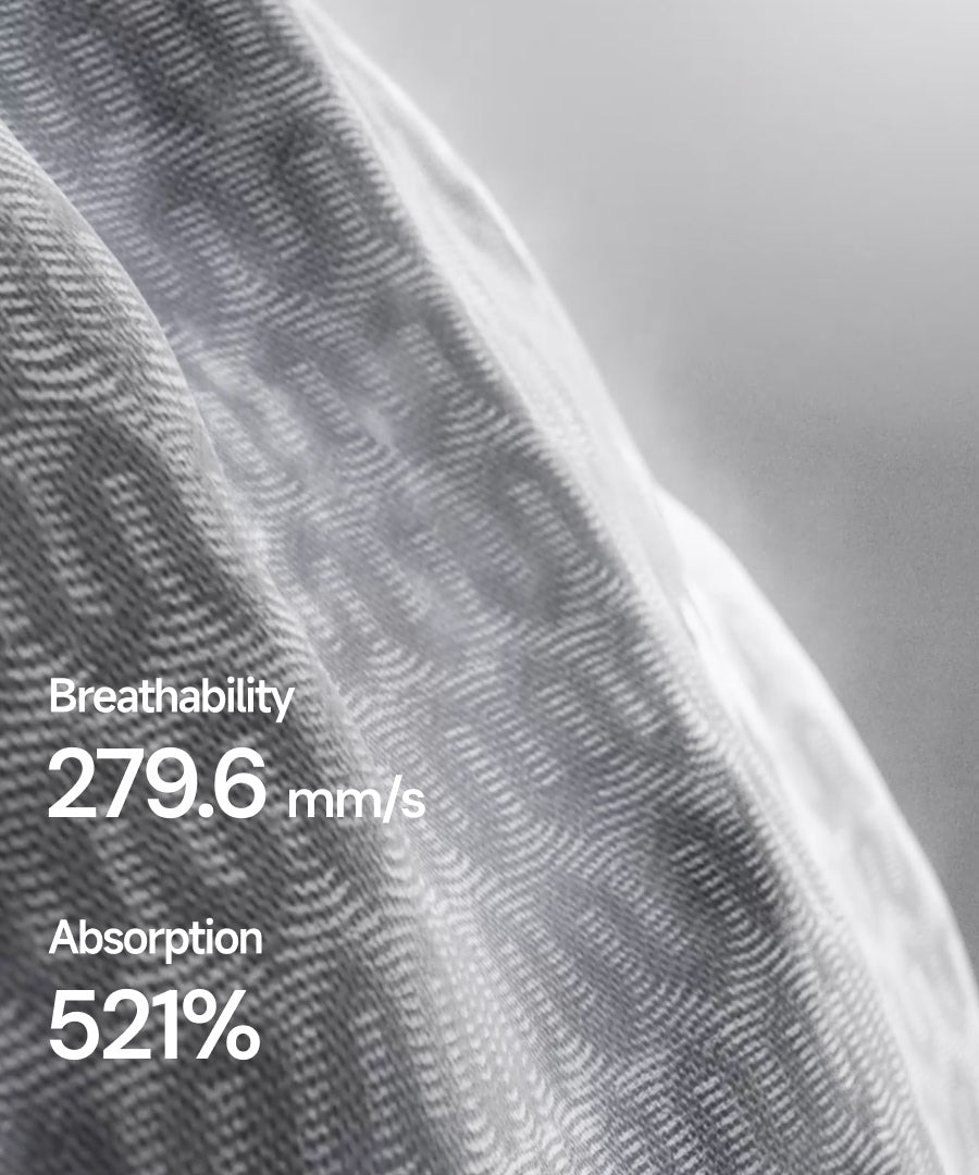 - Moisture-wicking fibers: 521% absorption, 279.6 mm/s breathability