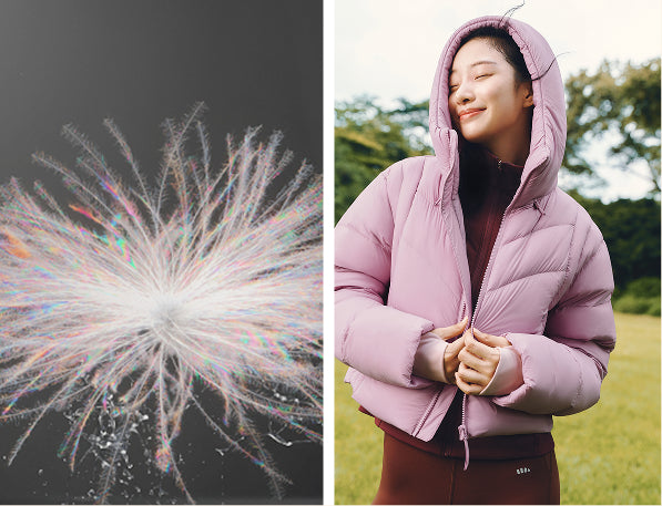 The micro-film coating repels moisture for up to 1000 minutes, keeping down clusters dry and fluffy even in rain or snow. Machine washable without clumping.