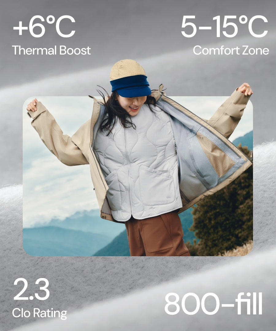 With warmth comparable to 800-fill down, the insulation achieves a 2.3 Clo rating and delivers up to +6°C thermal boost, keeping you comfortable in 5°C–15°C conditions.