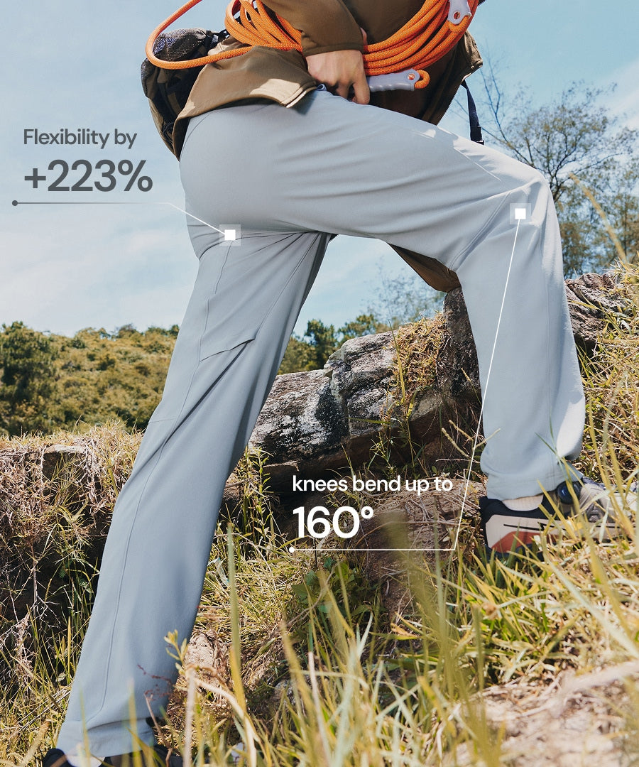 A tapered gusset boosts crotch flexibility by +223%, while articulated knees bend up to 160°. From climbing steep trails to everyday walks, the pants move fluidly with your body, never pulling or tearing.