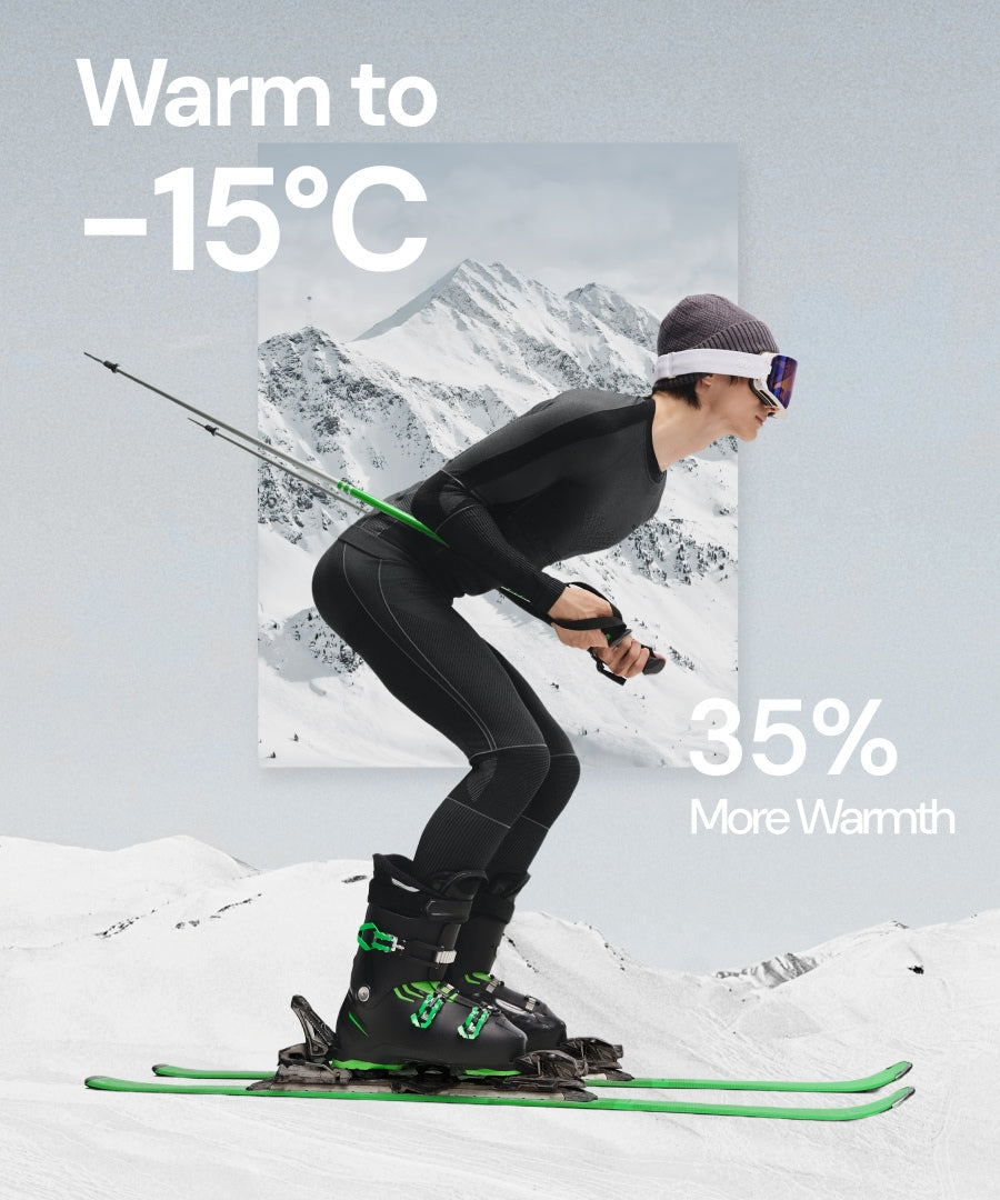 Infused with far-infrared fibers, the fabric absorbs body heat and releases it back, boosting skin temperature by up to +1.8°C for instant warmth.